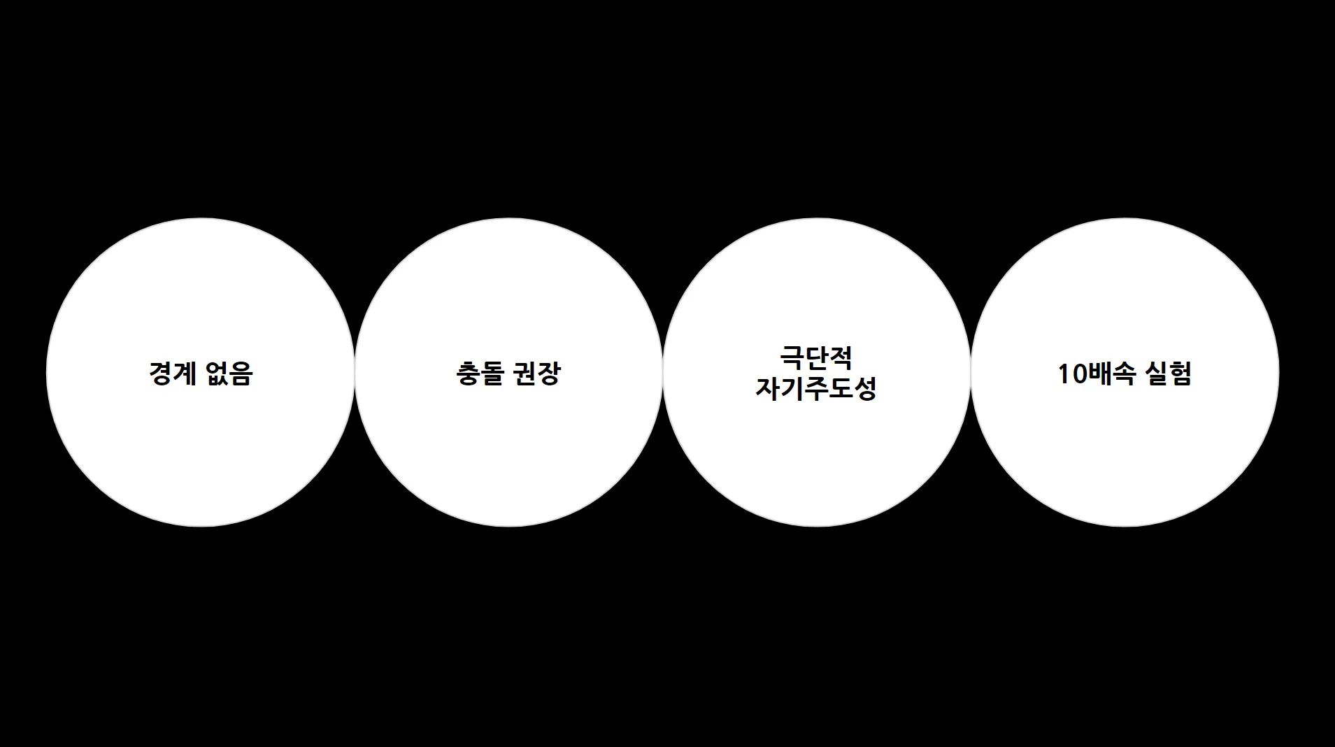 이에 NBT가 창립부터 지금까지 지켜왔고, 앞으로도 변하지 않는 본질에 대해 약 6개월 동안 구성원들을 인터뷰하고 문서로 정리했다. 우리가 일하는 방식을 ‘NBT SPIRIT’로 명명하고 ‘경계 없음’, ‘충돌 권장’, ‘극단적 자기주도성’, ’10배속 실험’이라는 4가지 키워드를 도출했다.